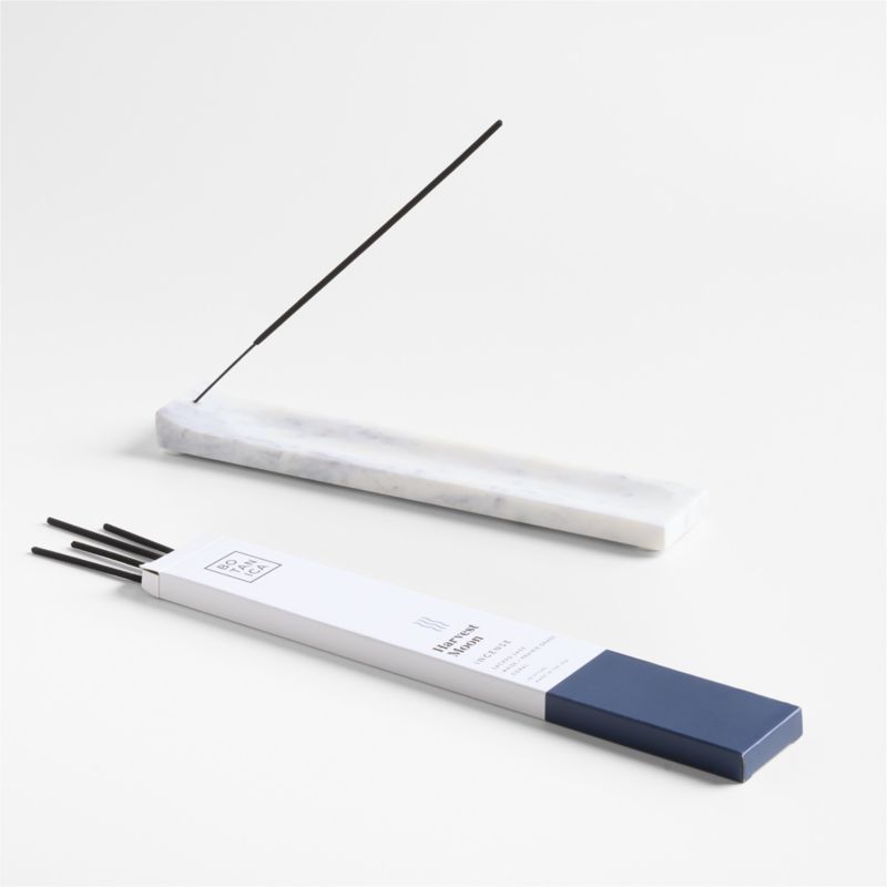 This set elevates the incense-burning experience with white marble and premium essential oils. Talented artisans polish and finish each marble incense holder by hand, showcasing the gorgeous stone. The slim rectangle curves up slightly at the end with a hole that holds a stick at an angle. Botanica's incense transforms a space into a luxuriously calm retreat. Infused with high-quality fragrance and essential oils, the Harvest Moon scent fills the air with fragrances of herbaceous sage, sweet maize, earth prairie grass and resinous copal. This set makes a thoughtful housewarming gift or addition to a spa-themed basket.