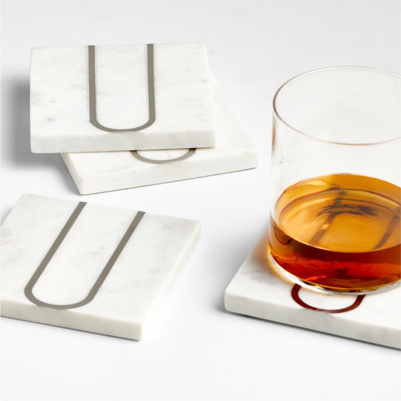 Proclaim your name with our monogrammed marble coasters. Each square of white marble in the four-piece set is inlaid with a single stainless steel letter "U" in a clean-lined, modern font. Talented artisans carve, inlay and finish the coasters by hand, making each one unique. Ours exclusively, this set of four monogrammed coasters make a thoughtful shower, wedding or graduation gift.