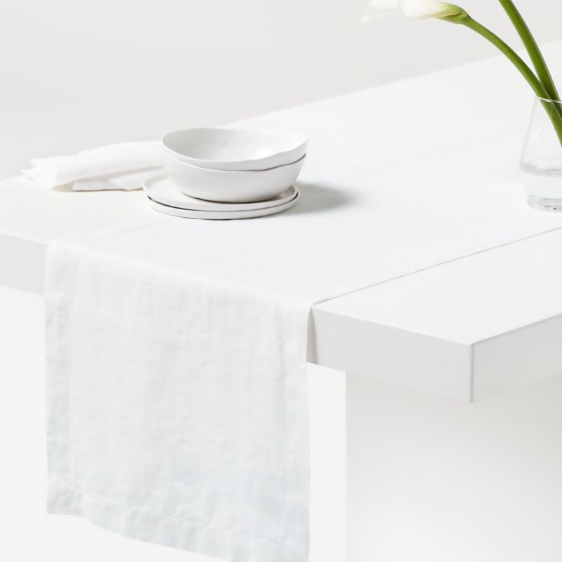 Part of our Marin table collection, this pure white table runner is made of quality European linen that's exceptionally soft and supple. Each white runner is pre-washed for extra softness and tailored with mitered corners to keep the look neat and crisp.