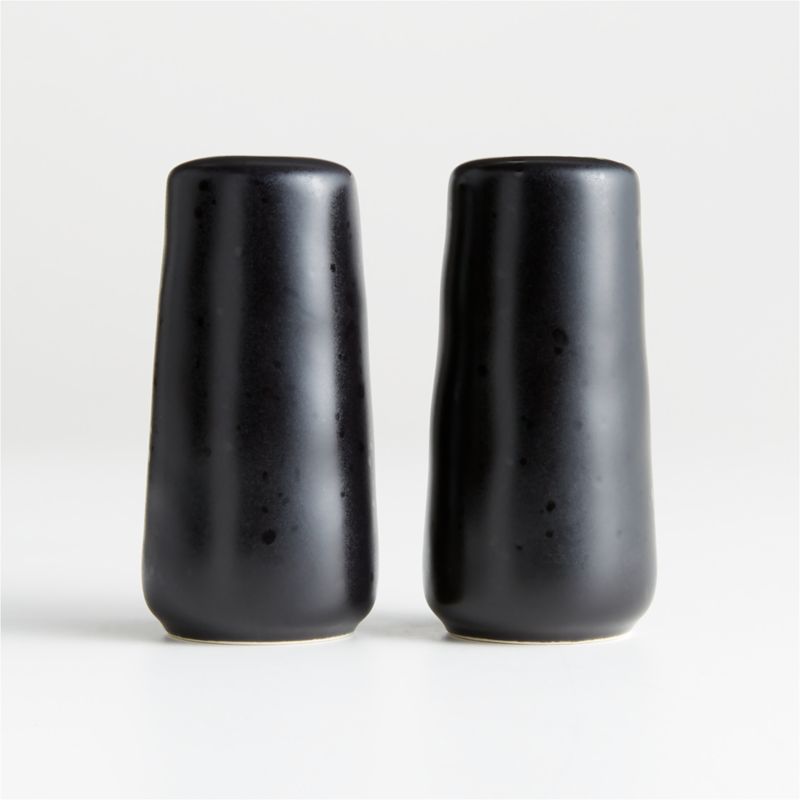 Complete the table with a salt and pepper set inspired by our coveted Marin dinnerware and serveware. Finished with a reactive matte black glaze, the stoneware shakers exhibit the same free-form, organic curves as the coordinating dishes and serving pieces. Keep one set on the dining table and one next to the stove for a cohesive, artisanal look. Our exclusive black salt and pepper shaker set makes a thoughtful gift for someone who adores their black Marin dinnerware. Each set will have its own distinctive look due to the reactive nature of the glaze.