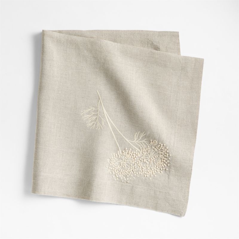 Part of our Marin table linens made with exceptionally soft and supple linen, this vintage-inspired napkin is embroidered with a sprig of flowering dill. A variety of off-white stitches describes the plant's feathery leaves and delicate umbels while creating subtle tone-on-tone texture. Like our other Marin napkins, this floral-themed cloth unfolds to a generous 22-inch square, pre-washed for extra softness and tailored with mitered corners.