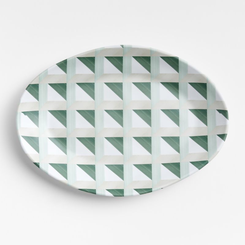 Feel free to set an artisan-inspired table for dinner parties on the patio or busy family gatherings with the melamine version of our popular Marin stoneware collection. This durable platter serves up grilled dishes or appetizers, fooling the eye with the same organic shape and artisanal antiquing along the rim as its glazed ceramic counterpart. Patterned with a trompe l'oeil dimensional pattern in white, grey and greens, the look is fresh and modern for summer. Pair the geo print serving plate with coordinating solid pieces in the collection for design-forward—and carefree—outdoor or indoor dining.
