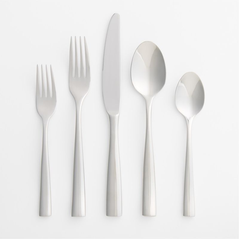 Clean, sophisticated design sets a fashionable table. Simple and striking, this polished flatware is compatible with a wide variety of dinnerware. Well-balanced and comfortable in the hand, with a smooth, bright mirror finish. Includes 4 5-piece placesettings.