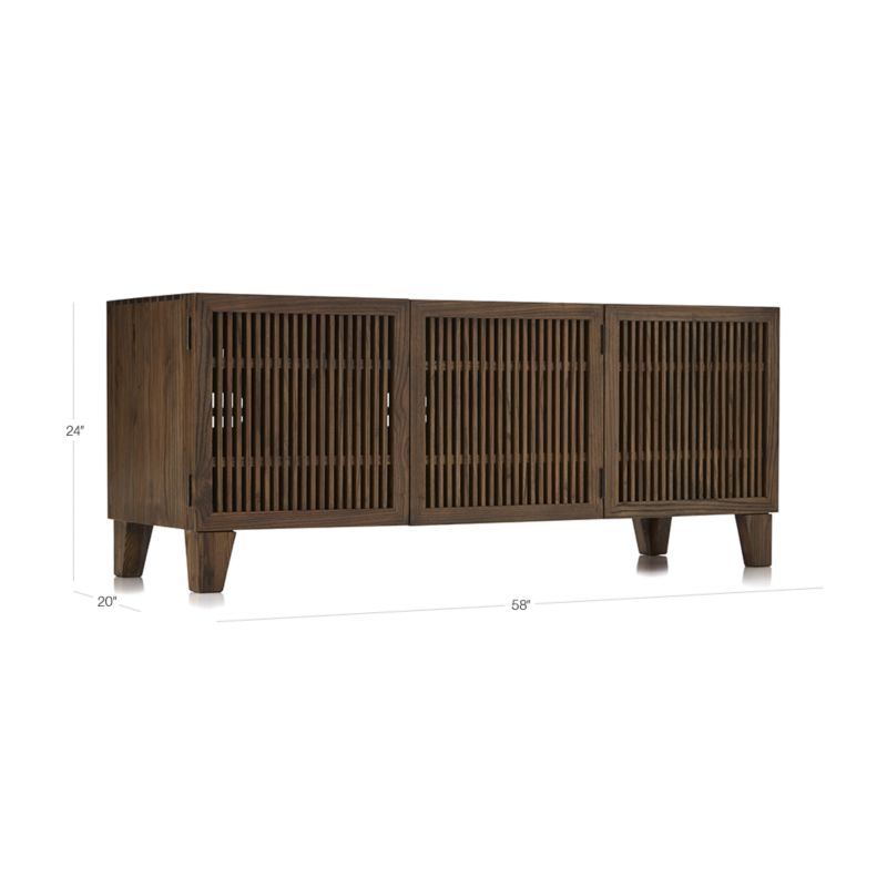 Marin's slatted doors allow for easy remote control signal access to electronics, opening to two adjustable shelves. The inherent beauty and grain of the wood are brought out by its shiitake finish and an application of tung tree oil, a natural substance derived from the seeds of the tung tree nut. The Marin Shiitake 58" Media Console is a Crate and Barrel exclusive.