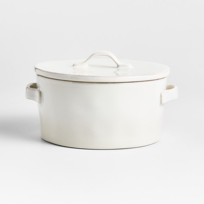 Designed to coordinate with our exclusive Marin tableware collection, this stoneware casserole is high-fired and glazed in soft white, with hand-antiquing for an organic and artisanal feel. Use the gently curved handles to carry the lidded baker from the oven to the table for effortlessly elegant serving. The handled lid will help keep your shepherd's pie, zucchini casserole or sweet potato gratin warm until it's time to eat. To complete the look, pair with our other Marin serving pieces.