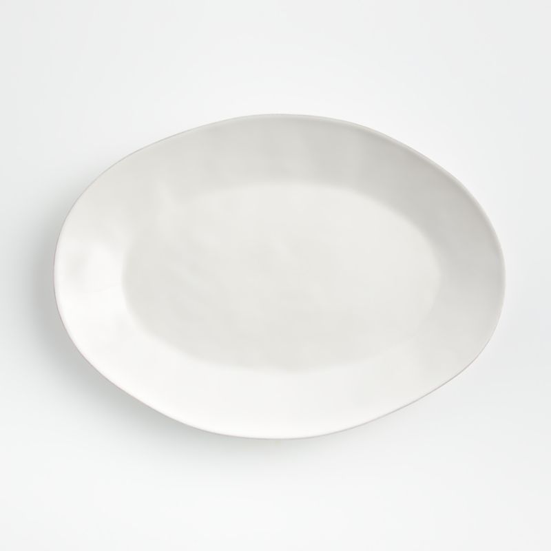 Artisanal ceramic platter is glazed a soft white with subtle hand-antiquing on the freeform rim. The unique form suits organic modern tables and is plenty chic for elegant occasions, while the durable stoneware is sturdy enough for use every day. Microwave-safe and oven-safe up to 300°F, our small oval serving platter is also dishwasher-safe for easy cleanup after family meals and dinner parties. For a coordinated dining experience, set a table with our Marin white appetizer plates, salad plates, dinner plates, bowls and other serving pieces, all Crate and Barrel exclusives. Due to its handcrafted nature, each platter will be slightly unique.