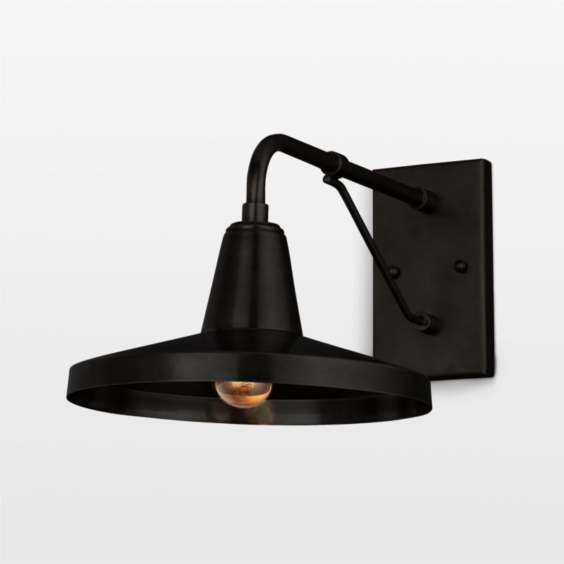 Solid brass shapes a black outdoor sconce with timeless seaside chic. Exuding classic maritime style with a touch of farmhouse, the Mariner gracefully suspends a wide, faceted shade from a braced cantilever. The matte black sconce casts warm and welcoming light, gleaming golden on your front porch, balcony or garage.