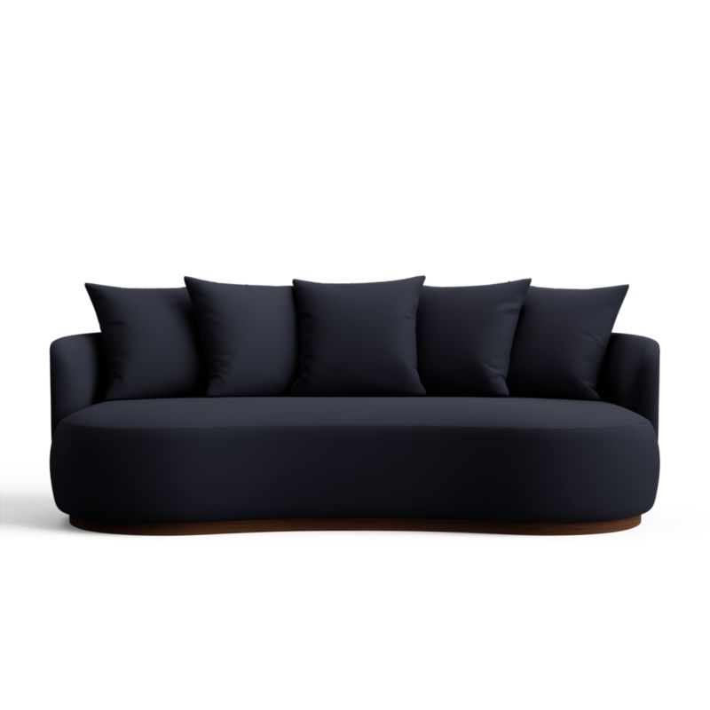 Feel free to rearrange, style or layer Martina's scatter-back pillows for the look and coziness level you desire. Tight seat cushioning accentuates the subtle kidney-shape and rounded corners of the deep-sitting bench seat. Proportioned low to highlight the pillow back, the rounded back wraps around the curved seat. Following the sofa's curves, a solid walnut plinth base adds the warmth of wood and lets the sofa float. Off-white linen-blend upholstery has the cozy feel of wool and a rich textural weave that yields subtle variations in tone.