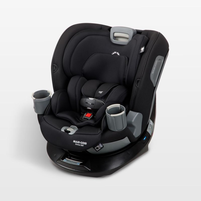 Keep your little one comfy and safe at every age and stage with the Maxi-Cosi Emme 360 Rotating All-in-One Convertible Car Seat. The seat swivels 360 degrees in all modes, making it easier to get your baby in and out of the car (and with less back strain). The multifunctional design includes rear-facing, forward-facing and booster seat options to grow with babies to big kids. The harness features a one-handed ClipQuik magnetic chest clip, and the seat is equipped with TensionFix, a red-to-green tension-sensitive indicator that shows you when the seatbelt has tension. Raise the integrated QuikFit headrest and harness system with one hand to perfectly fit your little one as they grow. ReclineFit provides five reclining positions for a relaxing ride, plus a just-right fit in your car. The infant pillow and cushions offer extra support and can be removed without rethreading the harness. And the PureCosi fabrics and padding—made without wool or added fire retardant treatment—are machine washable and dryer safe.