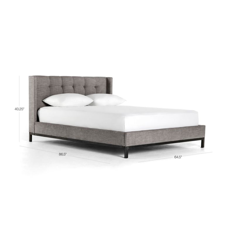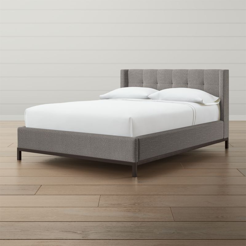 The Maxwell queen bed shelters sleepers with a low headboard upholstered in tweedy grey and detailed with rounded corners and button tufting. A simple gunmetal base adds contrast to the fabric-covered rails.