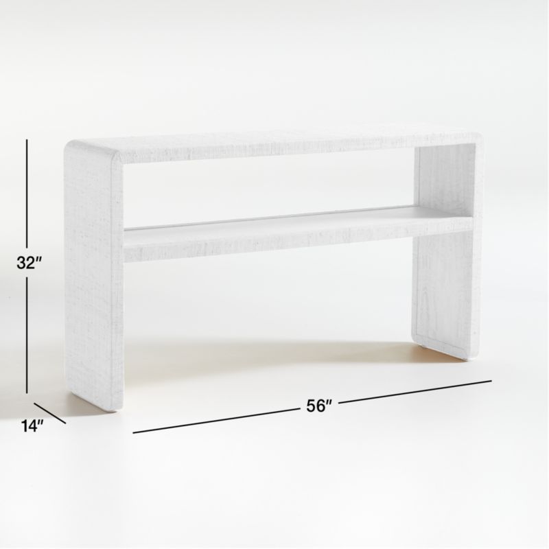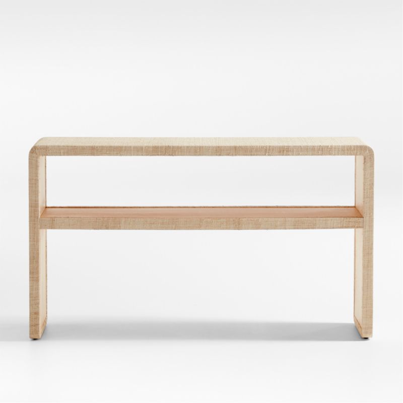 Waterfall edges and natural fiber give our Meadow console table its casual, coastal vibe. Handwoven grasscloth cloaks every line and curve of the table's exterior in a wealth of variegated natural color and organic texture. Glimpses of the wood frame on the interior enrich Meadow's appeal with material contrast. Flowing a seamless U-shape, the console table floats a single open shelf for storing magazines or books. The Meadow grasscloth console table is a Crate & Barrel exclusive.