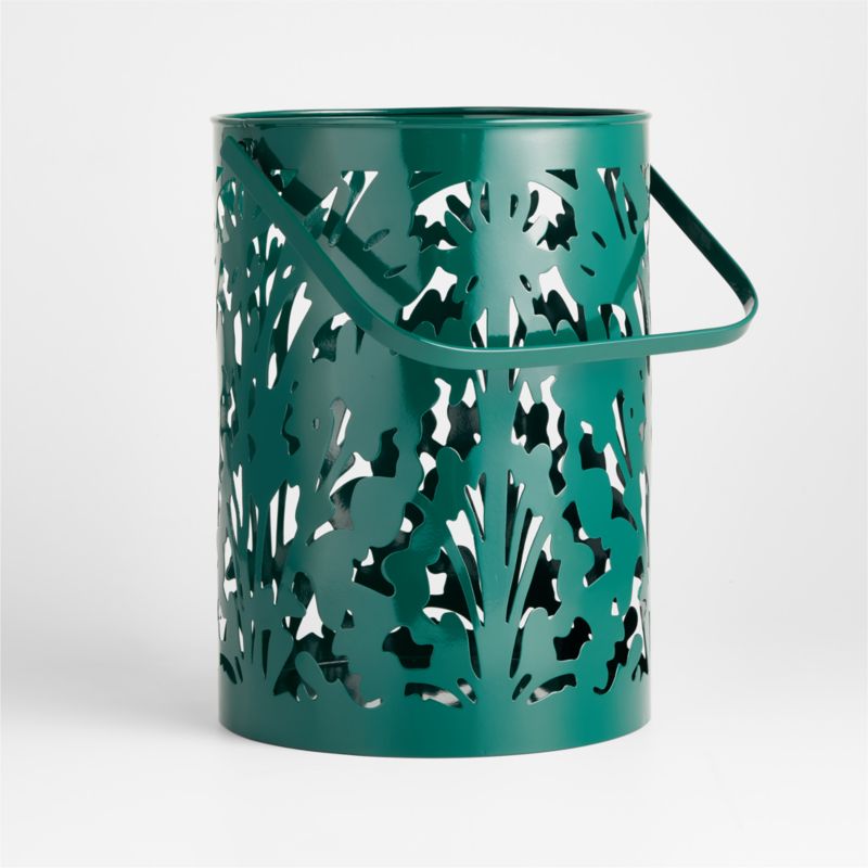 Inspired by Lucia Eames's love of nature, this metal lantern is a stunning take on one of her nature drawings. Add a candle within so the illumination shines through the cutouts, and watch the abstract botanical pattern create complex shadows. Finished in lush green, the medium iron lantern goes indoors and out, adding an intricate glow placed on a table or hung from a hook.