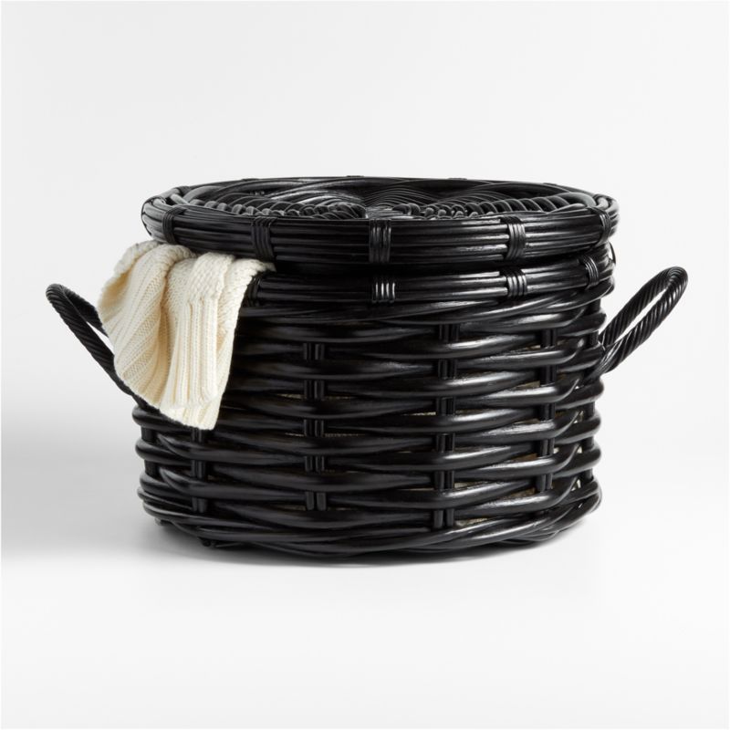 Painted matte black, rattan crafts a simple and elegant basket. Two twisted handles provide convenient handholds for carrying, and the lid keeps the look clean. Woven by hand, the medium basket neatly corrals everything from toys to throw pillows or serves as a modern organic cachepot for a potted plant. Pair with other pieces in our exclusive black rattan collection for elevated organization.
