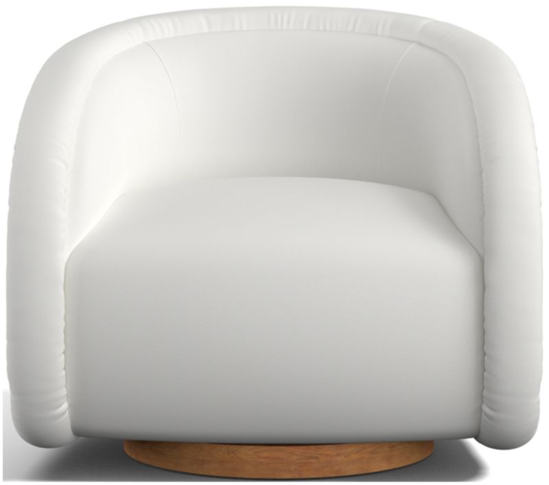 Sophisticated and current, our update to the barrel chair surrounds with comforting curves. Our take on this timeless style accentuates the rounded silhouette with padded channeling that flows in one continuous curve from arm to back to base and back again. Upholstered in olive green velvet, the tight-cushioned chair offers a substantial seat and low-profile, wrap-around back. The recessed swivel base provides a peek of wood grain finished in light barley brown. Alone or as a pair, our exclusive Medoc swivel chair puts a modern spin on a classic design.
