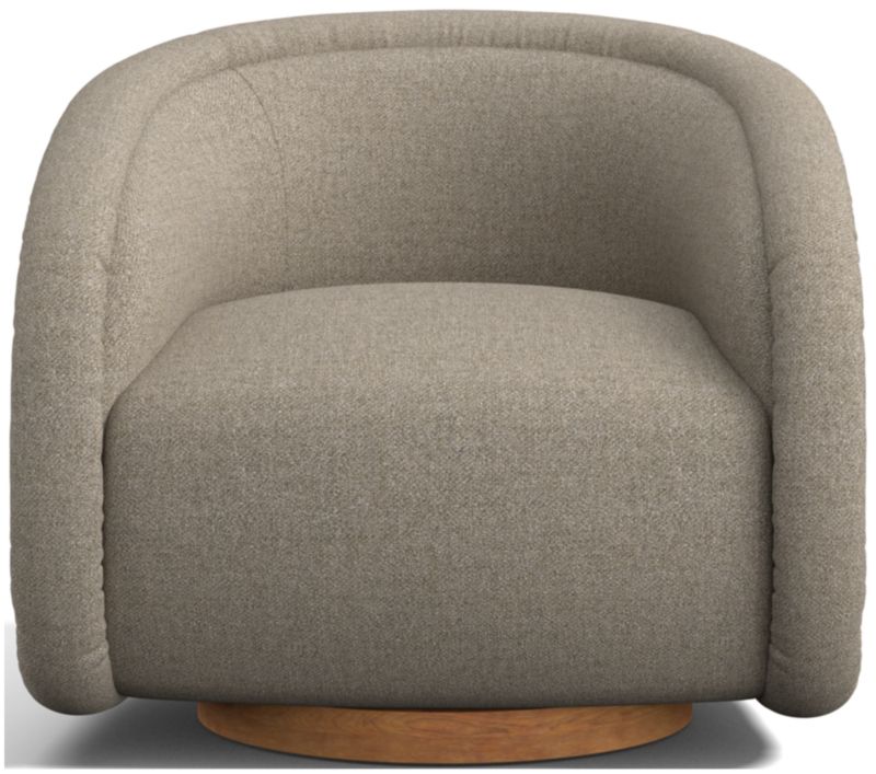 Sophisticated and current, our update to the barrel chair surrounds with comforting curves. Our take on this timeless style accentuates the rounded silhouette with padded channeling that flows in one continuous curve from arm to back to base and back again. Upholstered in a textured boucle in a light beige color, the tight-cushioned chair offers a substantial seat and low-profile, wrap-around back. The recessed swivel base provides a peek of wood grain finished in light barley brown. Alone or as a pair, our exclusive Medoc swivel chair puts a modern spin on a classic design.