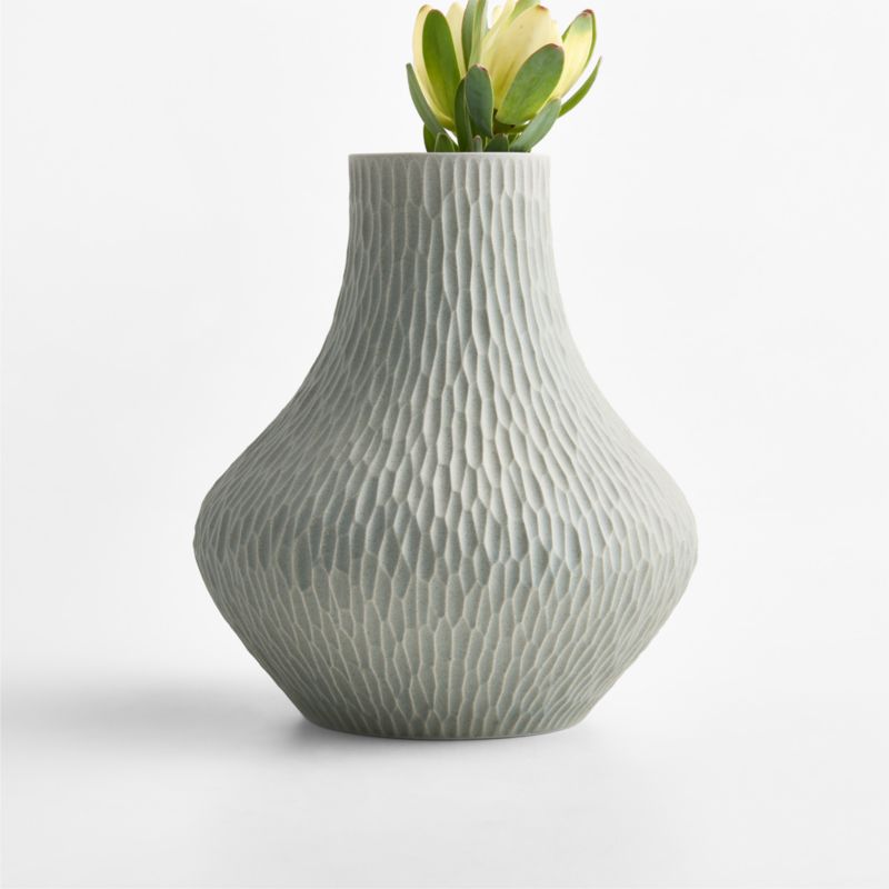 Epitomizing coastal chic, our Melbourne vase brings to mind rippled grey sand beaches or stormy waves. Talented artisans form the vase's graceful curves by hand before carving the flowing texture. Glossy white glaze on the interior contrasts with the dusty green exterior. Pair the small vase with its larger blue and cream counterparts for an understated oceanic arrangement.