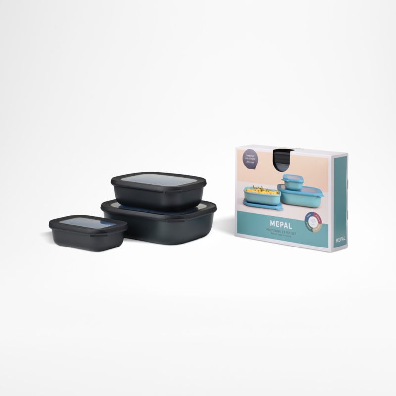 Kitchen storage goes fashionable in this stylish black set. Rectangular and shallow, the storage bowls make the most of refrigerator or freezer space. Transparent lids let you easily identify contents and provide an airtight and leakproof seal. Feel free to use the microwave-safe bowls to tote lunches, warm up leftovers or thaw ingredients. Featuring three sizes of nestable containers, the set makes a thoughtful gift for first-time apartment dwellers or homeowners.