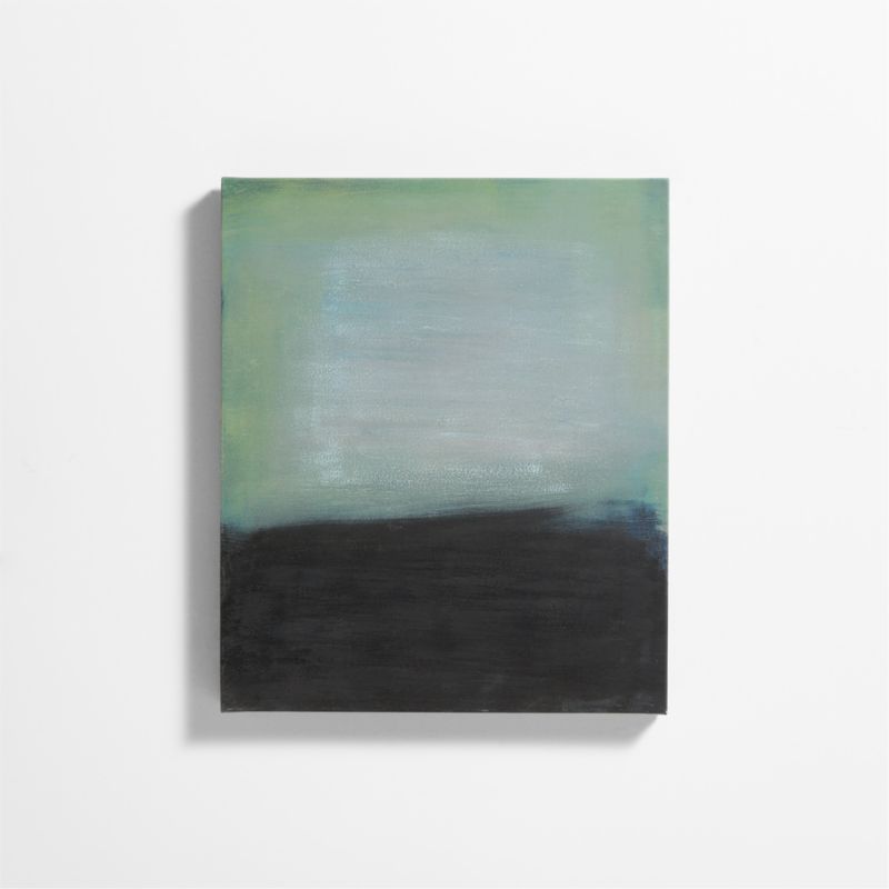 Deceptively simple and wonderfully abstract, this print's divided composition juxtaposes fields of green and charcoal. The work suggests an atmospheric rendering of land and sky with subtly layered color and broad brushstrokes. Printed on fiber-enhanced canvas, the giclee reproduction of the original acrylic painting is hand-embellished with added texture for a fresh-from-the-studio look. This work of art was selected by Athena Calderone for her exclusive Crate & Barrel collection.