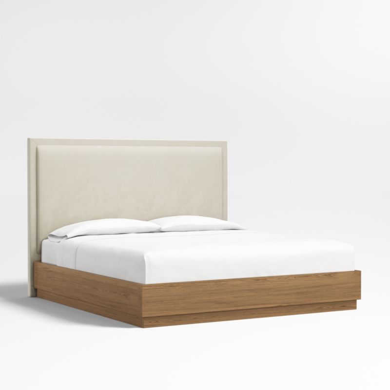 Our custom bed collection lets you mix and match our top-selling headboards and bases for a look that's truly yours. A tight border sets off the plush pillowed face of the Meraux headboard for a tailored update on a bedroom classic. Upholstered in Beige faux mohair, the headboard pairs beautifully with the Batten bed base, which features a sleek plinth design and the lively grain of oak veneer enhanced with a smoke grey finish.