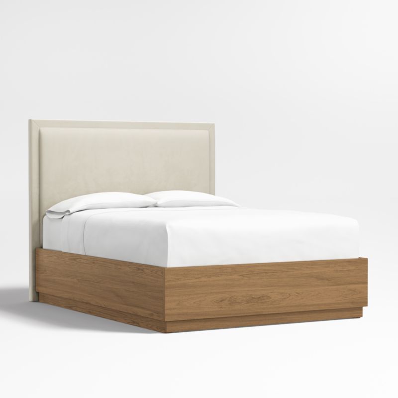 Our custom bed collection lets you mix and match our top-selling headboards and bases for a look that's truly yours. A tight border sets off the plush pillowed face of the Meraux headboard for a tailored update on a bedroom classic. Upholstered in Beige faux mohair, the headboard pairs beautifully with the Batten bed base, which features a sleek plinth design and the lively grain of oak veneer enhanced with a smoke grey finish. A great choice for storage-challenged bedrooms, Batten seamlessly integrates a drawer at the foot of the base for placing bedding, blankets and out-of-season garments.