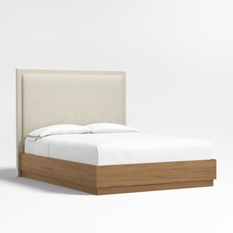 Our custom bed collection lets you mix and match our top-selling headboards and bases for a look that's truly yours. A tight border sets off the plush pillowed face of the Meraux headboard for a tailored update on a bedroom classic. Upholstered in Beige faux mohair, the headboard pairs beautifully with the Batten bed base, which features a sleek plinth design and the lively grain of oak veneer enhanced with a smoke grey finish.