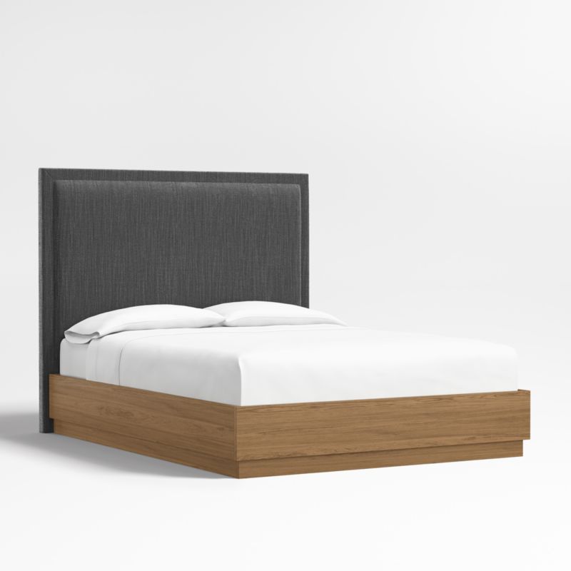 Our custom bed collection lets you mix and match our top-selling headboards and bases for a look that's truly yours. A tight border sets off the plush pillowed face of the Meraux headboard for a tailored update on a bedroom classic. Upholstered in a charcoal grey textured weave, the headboard pairs beautifully with the Batten bed base, which features a sleek plinth design and the lively grain of oak veneer enhanced with a smoke grey finish.