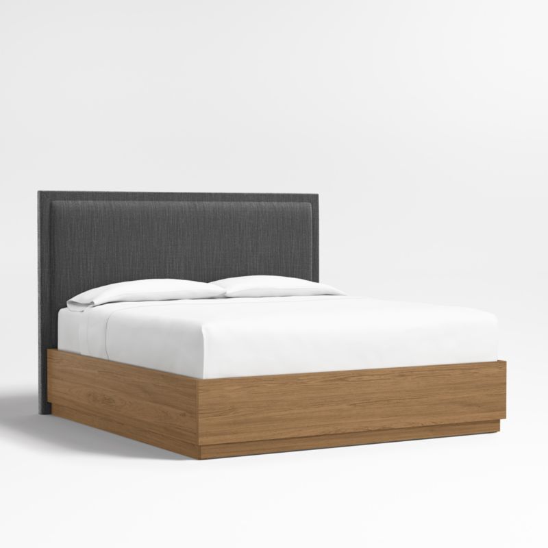 Our custom bed collection lets you mix and match our top-selling headboards and bases for a look that's truly yours. A tight border sets off the plush pillowed face of the Meraux headboard for a tailored update on a bedroom classic. Upholstered in a charcoal grey textured weave, the headboard pairs beautifully with the Batten bed base, which features a sleek plinth design and the lively grain of oak veneer enhanced with a smoke grey finish. A great choice for storage-challenged bedrooms, Batten seamlessly integrates a drawer at the foot of the base for placing bedding, blankets and out-of-season garments.