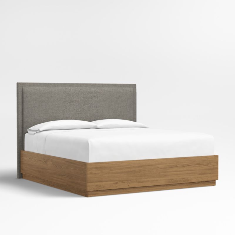 Our custom bed collection lets you mix and match our top-selling headboards and bases for a look that's truly yours. A tight border sets off the plush pillowed face of the Meraux headboard for a tailored update on a bedroom classic. Upholstered in a dark grey soft bouclé weave, the headboard pairs beautifully with the Batten bed base, which features a sleek plinth design and the lively grain of oak veneer enhanced with a smoke grey finish. A great choice for storage-challenged bedrooms, Batten seamlessly integrates a drawer at the foot of the base for placing bedding, blankets and out-of-season garments.
