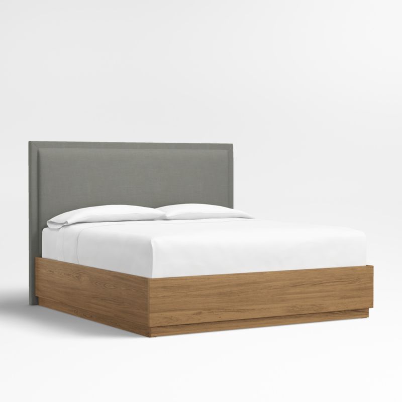 Our custom bed collection lets you mix and match our top-selling headboards and bases for a look that's truly yours. A tight border sets off the plush pillowed face of the Meraux headboard for a tailored update on a bedroom classic. Upholstered in a graphite grey linen blend, the headboard pairs beautifully with the Batten bed base, which features a sleek plinth design and the lively grain of oak veneer enhanced with a smoke grey finish. A great choice for storage-challenged bedrooms, Batten seamlessly integrates a drawer at the foot of the base for placing bedding, blankets and out-of-season garments.