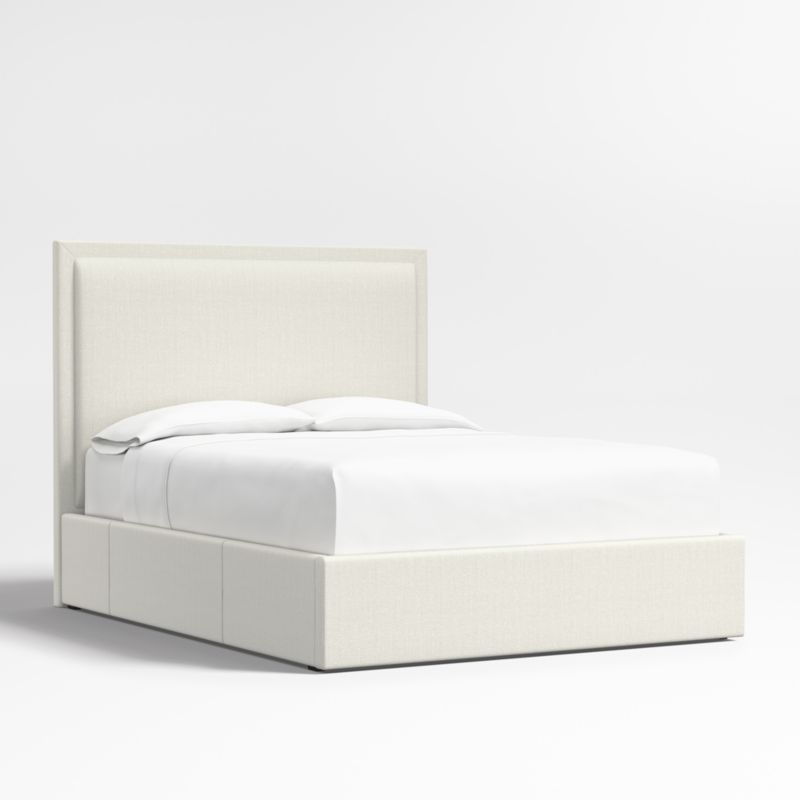 Our custom bed collection lets you mix and match our top-selling headboards and bases for a look that's truly yours. A tight border sets off the plush pillowed face of the Meraux headboard for a tailored update on a bedroom classic. The base integrates three roomy drawers—one on each side and one at the foot of the bed—for storing off-season clothes and extra blankets. As a plus, the side drawers open with just enough clearance to avoid hitting nightstands and other bedroom furniture. Both pieces are upholstered in a textured weave in ivory.