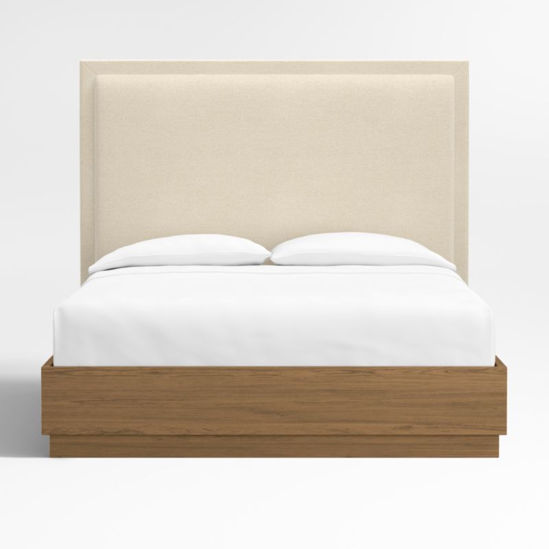 Our custom bed collection lets you mix and match our top-selling headboards and bases for a look that's truly yours. A tight border sets off the plush pillowed face of the Meraux headboard for a tailored update on a bedroom classic. Upholstered in an ivory soft bouclé weave, the headboard pairs beautifully with the Batten bed base, which features a sleek plinth design and the lively grain of oak veneer enhanced with a smoke grey finish.