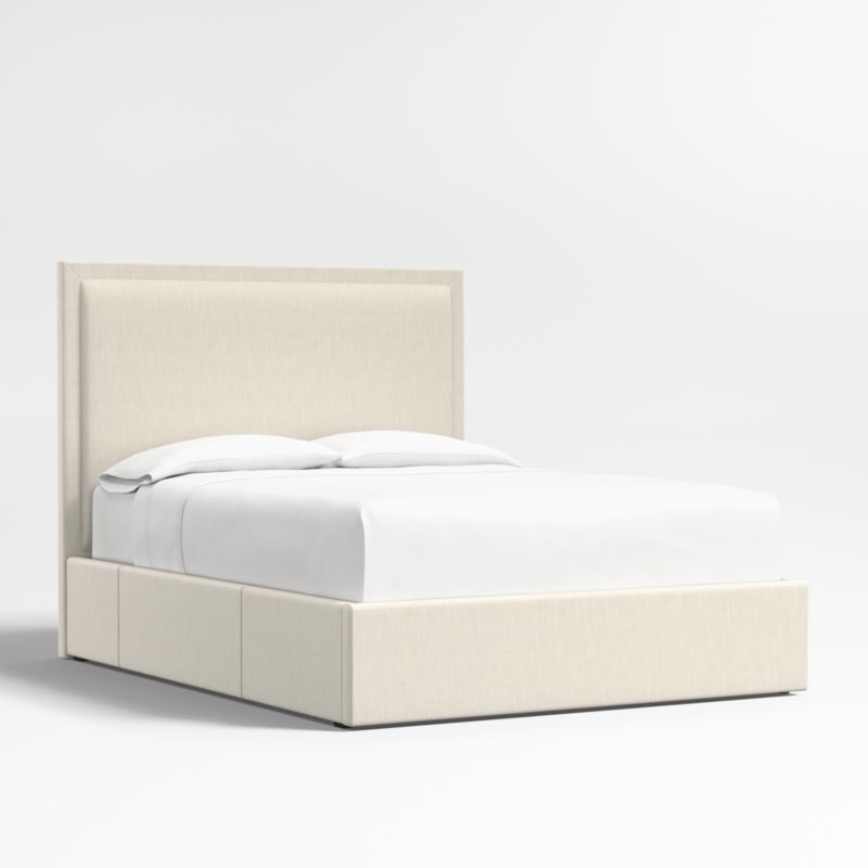 Our custom bed collection lets you mix and match our top-selling headboards and bases for a look that's truly yours. A tight border sets off the plush pillowed face of the Meraux headboard for a tailored update on a bedroom classic. The base integrates three roomy drawers—one on each side and one at the foot of the bed—for storing off-season clothes and extra blankets. As a plus, the side drawers open with just enough clearance to avoid hitting nightstands and other bedroom furniture. Both pieces are upholstered in a linen blend in ivory.