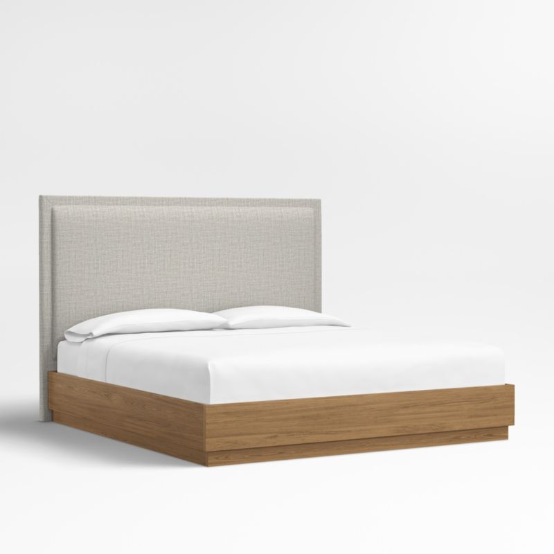 Our custom bed collection lets you mix and match our top-selling headboards and bases for a look that's truly yours. A tight border sets off the plush pillowed face of the Meraux headboard for a tailored update on a bedroom classic. Upholstered in a misty grey textured weave, the headboard pairs beautifully with the Batten bed base, which features a sleek plinth design and the lively grain of oak veneer enhanced with a smoke grey finish.