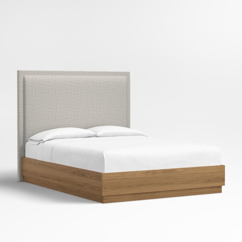 Our custom bed collection lets you mix and match our top-selling headboards and bases for a look that's truly yours. A tight border sets off the plush pillowed face of the Meraux headboard for a tailored update on a bedroom classic. Upholstered in a misty grey textured weave, the headboard pairs beautifully with the Batten bed base, which features a sleek plinth design and the lively grain of oak veneer enhanced with a smoke grey finish.