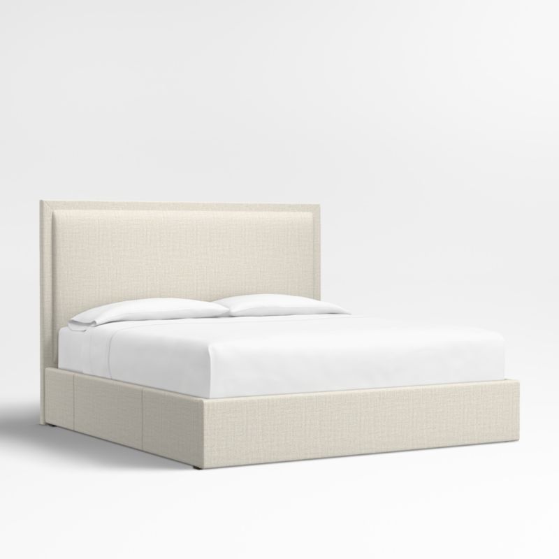 Our custom bed collection lets you mix and match our top-selling headboards and bases for a look that's truly yours. A tight border sets off the plush pillowed face of the Meraux headboard for a tailored update on a bedroom classic. The base integrates three roomy drawers—one on each side and one at the foot of the bed—for storing off-season clothes and extra blankets. As a plus, the side drawers open with just enough clearance to avoid hitting nightstands and other bedroom furniture. Both pieces are upholstered in a textured weave in decor-friendly beige.