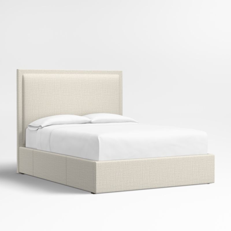 Our custom bed collection lets you mix and match our top-selling headboards and bases for a look that's truly yours. A tight border sets off the plush pillowed face of the Meraux headboard for a tailored update on a bedroom classic. The base integrates three roomy drawers—one on each side and one at the foot of the bed—for storing off-season clothes and extra blankets. As a plus, the side drawers open with just enough clearance to avoid hitting nightstands and other bedroom furniture. Both pieces are upholstered in a textured weave in decor-friendly beige.