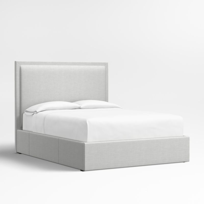 Our custom bed collection lets you mix and match our top-selling headboards and bases for a look that's truly yours. A tight border sets off the plush pillowed face of the Meraux headboard for a tailored update on a bedroom classic. The base integrates three roomy drawers—one on each side and one at the foot of the bed—for storing off-season clothes and extra blankets. As a plus, the side drawers open with just enough clearance to avoid hitting nightstands and other bedroom furniture. Both pieces are upholstered in a linen blend in cool grey.