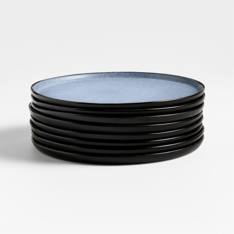 Inspired by Iceland's unique landscape marked with lava fields and glacial ice, our two-tone Mercer dinnerware features semi-matte charcoal exteriors and icy blue reactive glaze interiors. The recycled clay salad plates in this set of eight fuse refinement and rusticity with raised freeform rims and a rippled surface. Smooth enough to not harm tables, the unglazed ceramic bottoms further enhance Mercer's artisanal look.