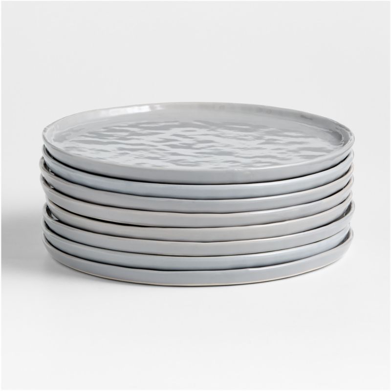 Our contemporary porcelain dinnerware sets a table of refinement and rusticity. This set of eight round, low-profile dinner plates takes on organic overtones with freeform rims and a finely "hammered" surface that ripples the light. Made of grey-glazed natural clay, the plates may vary slightly in color. Smooth enough to not harm tables, the unglazed ceramic bottoms give each piece an artisanal look.