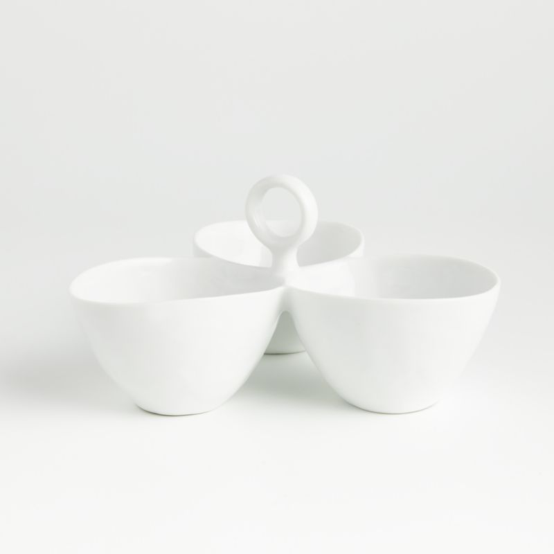 Contemporary porcelain whiteware represents a fusion of refinement and rusticity. The round slim profile of this three-part divided server takes on organic overtones with freeform rim and a finely "hammered" surface that ripples the light. A trio of small bowls offers easy serving options for condiments and candies, toppings and sauces. Mercer Round and Square Dinnerware are also available. Smooth enough to not harm tables, the unglazed ceramic bottom surface gives each piece an artisanal look.