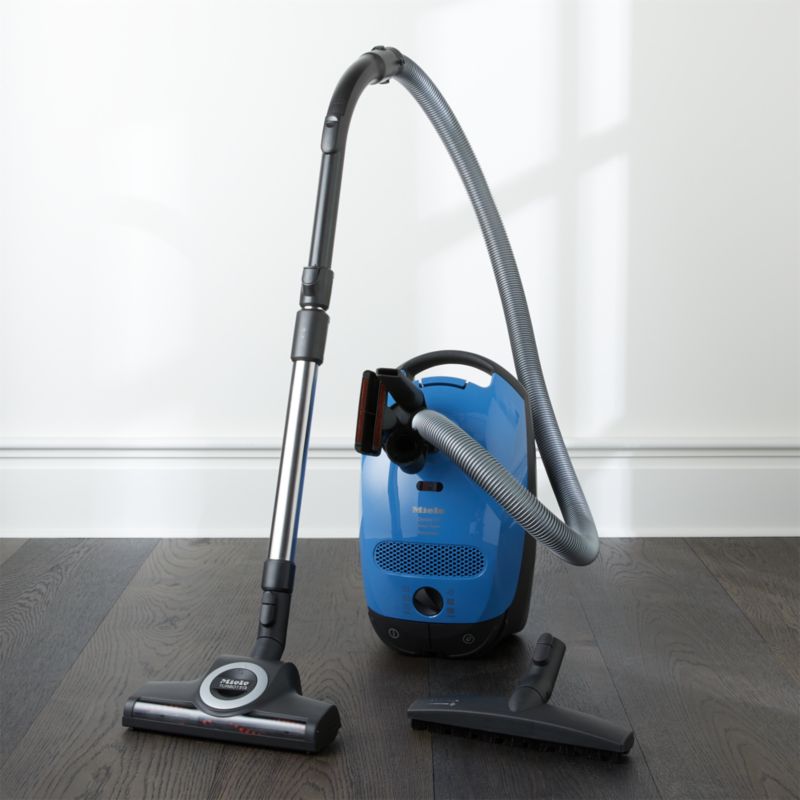 With the help of a TurboBrush floorhead that brushes as it vacuums, Miele's compact canister vacuum cleaner is designed to clean low- to medium-pile carpets and rugs and is ideal for homes with pets. A parquet option with soft, natural bristles removes dust and dirt from wood floors and other hard surfaces without scratching. The bright blue vacuum comes with three clip-on attachments, swivel wheels for smooth maneuverability, a telescoping cleaning wand, and a long cord that retracts with the press of a pedal.
