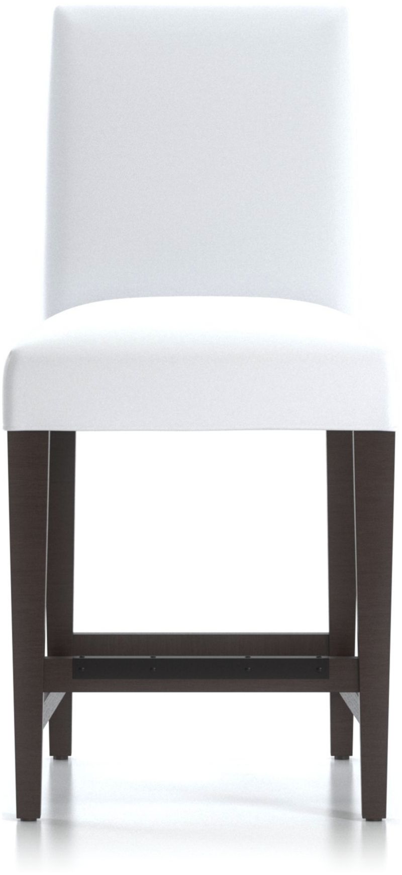 The Miles counter stool pulls up to high dining tables and kitchen islands with polished proportions and casual formality. Upholstered for comfort, the counter stool has hardwood legs with a foot rest that taper gracefully to the floor.  The Miles Upholstered Counter Stool is a Crate and Barrel exclusive.