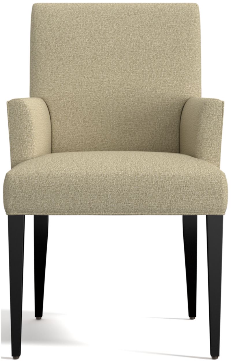 Classic with polished proportions and casual formality, the Miles dining arm chair offers endless comfort with a gently flared tight seat and back upholstered in an easy-care weave. The upholstered dining chair's slim, warm grey hardwood legs taper gracefully to the floor. The Miles Dining Arm Chair is a Crate and Barrel exclusive.