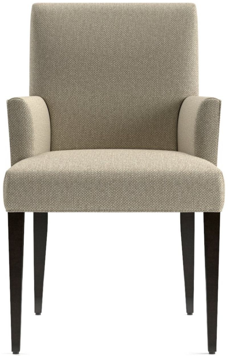 Classic with polished proportions and casual formality, the Miles dining arm chair offers endless comfort with a gently flared tight seat and back upholstered in an easy-care weave. The upholstered dining chair's slim, warm grey hardwood legs taper gracefully to the floor. The Miles Dining Arm Chair is a Crate and Barrel exclusive.