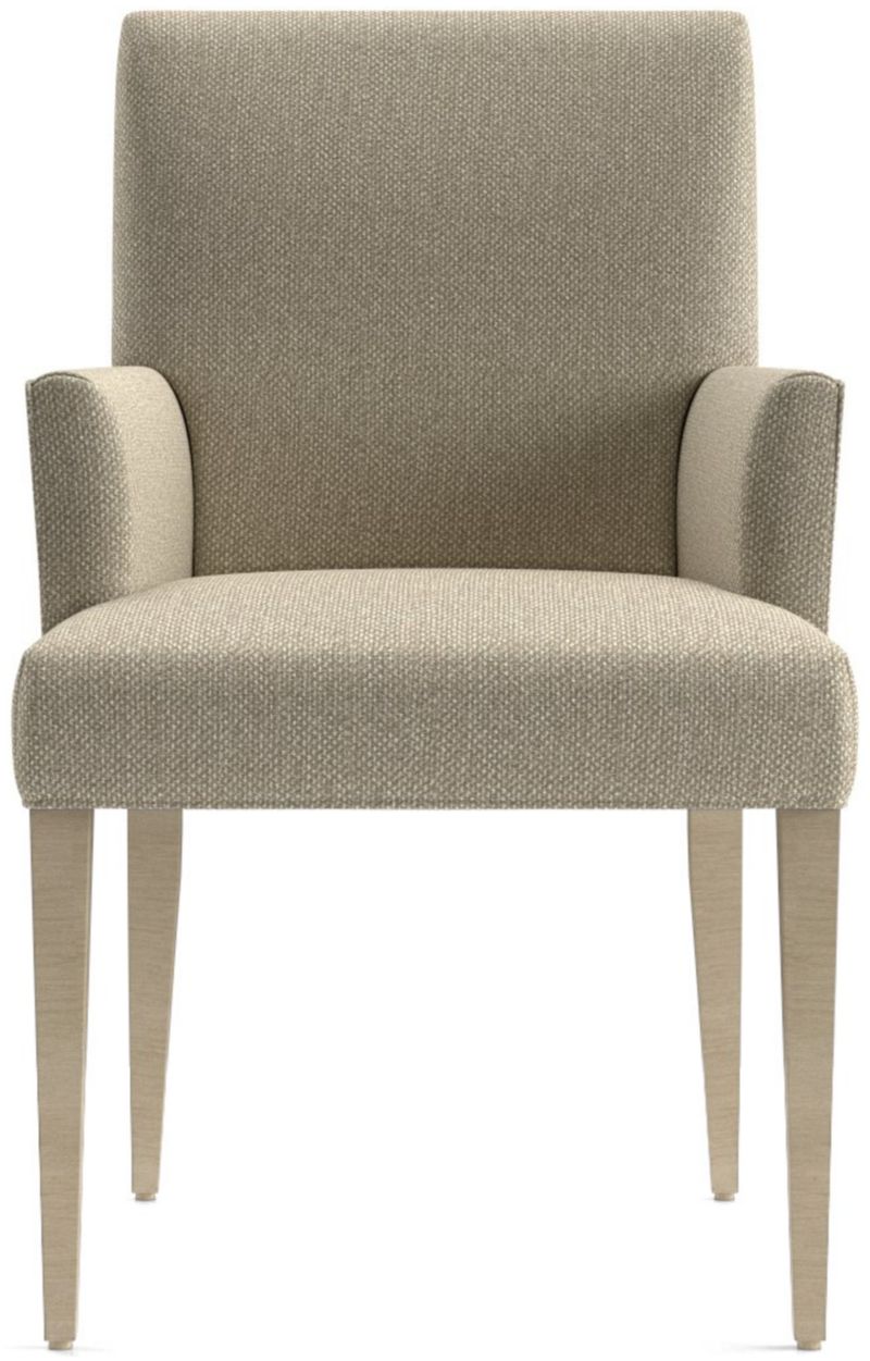 Classic with polished proportions and casual formality, the Miles dining arm chair offers endless comfort with a gently flared tight seat and back upholstered in an easy-care weave. The upholstered dining chair's slim, warm grey hardwood legs taper gracefully to the floor. The Miles Dining Arm Chair is a Crate and Barrel exclusive.