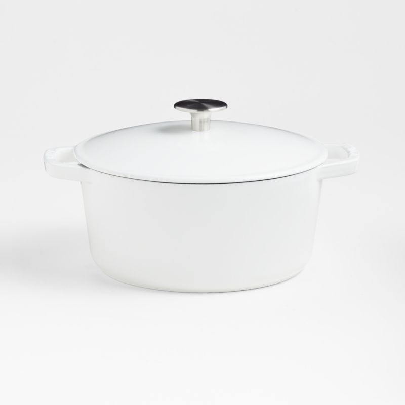 A modern-yet-timeless presence on your table, stove or open shelving, this mini cast iron Dutch oven delivers serious performance in crisp white. Coated with dual layers of porcelain enamel inside and out, the pan requires no seasoning. Topped with a gold-finished knob on its lid, the mini Dutch oven goes beautifully from any type of stovetop to oven to dining table to make a striking presentation for pot roast, Italian wedding soup or peach crumble for two.