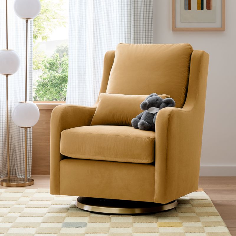 We tried to find the words to describe just how comfortable our exclusive Milo Glider is. In the end, the words "ridiculously comfortable" kept coming out of our mouths. This modern upholstered rocking chair and gliding ottoman were exclusively designed just for us by the amazing artisans at Monte Design. They feature kiln-dried hardwood frames, which will be sure to last for years to come. The incredible brushed gold metal pedestal bases give the chair and ottoman a look like no other.