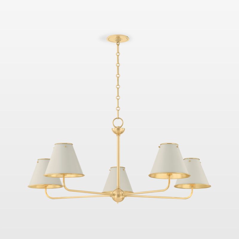 Well-tailored and understated, the Milton chandelier provides plenty of traditional-inspired style and useful illumination. Steel with an aged brass finish shapes the ceiling light's slender arms, eye-catching chain and spherical accents. Finished in crisp white, the five petite shades boast brass-finished interiors that reflect light with a golden glow.