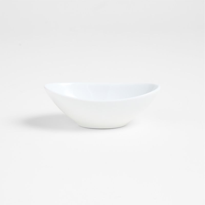 Sloped oval dish in bright white porcelain is sized to perfectly accommodate sauces, dips, condiments or individual servings of appetizers or desserts. The petite, gracefully curved bowl, a Crate and Barrel exclusive, pairs beautifully with our bright white porcelain dinnerware and serving pieces. Oven-safe to 350 degrees, our mini oval dish is perfect for presenting warm sauces and treats.