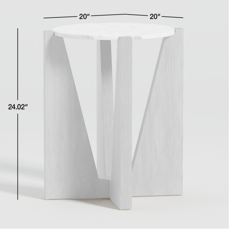 The black marble top of our Miro end table stuns with ivory veining, presented like a precious gem set within the prongs of a ring. Inspired by sculptural bronze tables from the 1970s, Miro's dynamic geometry plays with negative space in an airy arrangement of angular panels that support the round marble slab. Natural white oak veneer with vertical quartersawn grain is heavily wirebrushed to emphasize the base's linear look. Ideal pulled up next to an armchair or sofa, the black marble end table is part of our exclusive Miro collection, which mixes and matches bases and tabletops in modern, elevated combinations.
